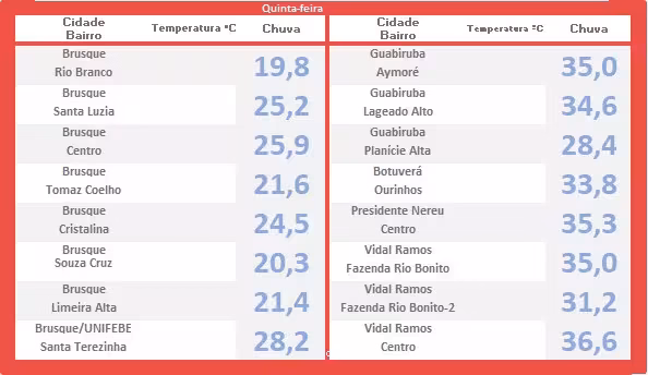 Confira abaixo o levantamento dos índices pluviométricos assinalados em cada um dos lugares mencionados em anexo. Os maiores acumulados foram verificados em Vidal Ramos e Guabiruba, com um registro de 36,6mm e 35,0mm, respectivamente.