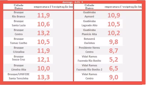 A tabela exposta abaixo traz o levantamento dos índices mínimos, feito junto aos termômetros da rede Groh Estações, aferidos logo após o romper da aurora deste domingo. Destaque para a Comunidade de Fazenda Rio Bonito, em Vidal Ramos, que começou o dia marcando apenas 5ºC: