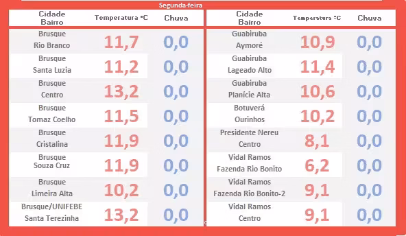 Na tabela a seguir, você pode conferir as temperaturas mínimas registradas logo após o amanhecer em cada local destacado em vermelho. Além disso, a apuração evidencia a ausência de chuva observada no período, ressaltado em azul. Acompanhe.