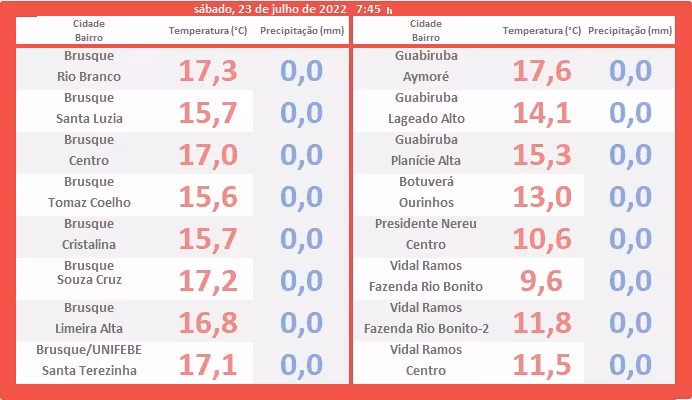 Prosseguindo com a edição do tempo deste sábado, vamos destacar agora, as temperaturas mínimas anotadas no Vale do Itajaí-Mirim durante a madrugada que passou. Os dados correspondem a cada lugar descrito em anexo na tabela.