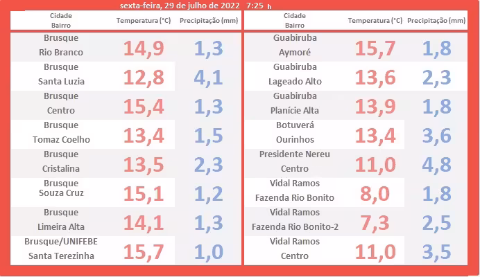 "Tempo aproveitável às práticas ao ar livre em geral na região brusquense, tanto no sábado, quanto no domingo. O amanhecer desses dois dias deve marcar mínimas entre 5 a 8ºC, num cenário típico de inverno".
