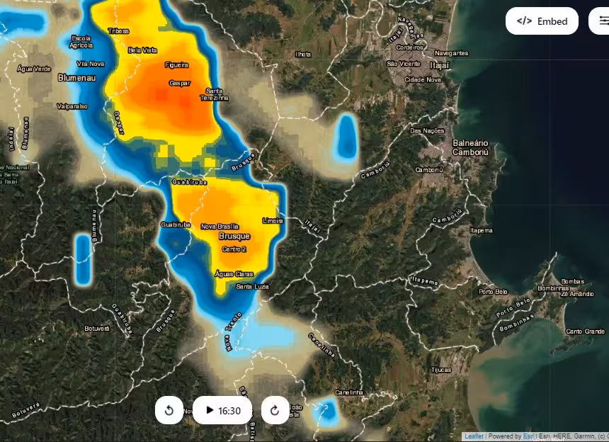 Abaixo temos a ilustração de radar, atualizada às 16h30, que mostra o tempo severo agindo sobre Brusque e o entorno da região nesse horário.