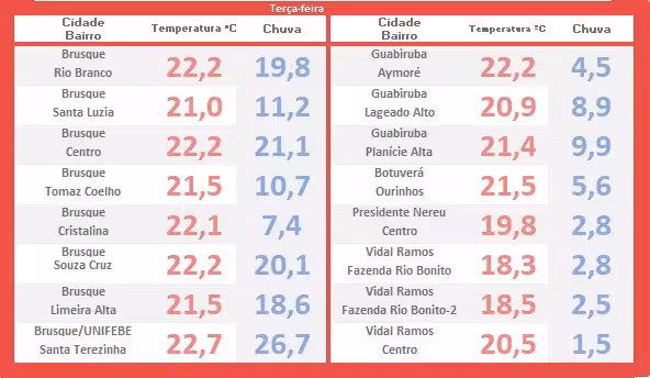 Na pesquisa apresentada a seguir, confira também as temperaturas mínimas pontuadas por toda a região brusquense logo após o romper da aurora (em vermelho). Todos os dados derivam da rede Groh Estações.