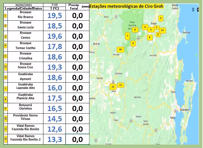 Abaixo estão as mínimas registradas por todo o Vale do Itajaí-Mirim. Destaque para Vidal Ramos, que começou a terça-feira nos 12ºC:
