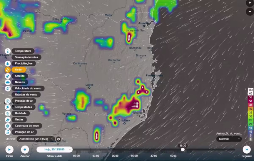 Pela imagem de radar, atualizada às 16h30, é possível observar os locais com tempo severo nesse horário. Está ilustrado nas manchas coloridas da figura do mapa.
