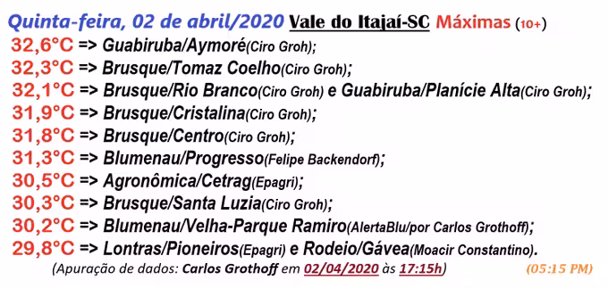 O ar abafado presente na madrugada desta quinta-feira, 2, seguiu forte no Vale do Itajaí ao longo do dia. Os maiores picos de toda a região foram registrados em Brusque e Guabiruba. Os termômetros nestes 2 municípios mediram 32ºC de máxima.