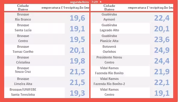 Diante da nebulosidade prevista, mais uma vez as temperaturas não vão subir muito, com picos ficando abaixo dos 20ºC, potencializando sensação de frio aos moradores de Brusque e região".