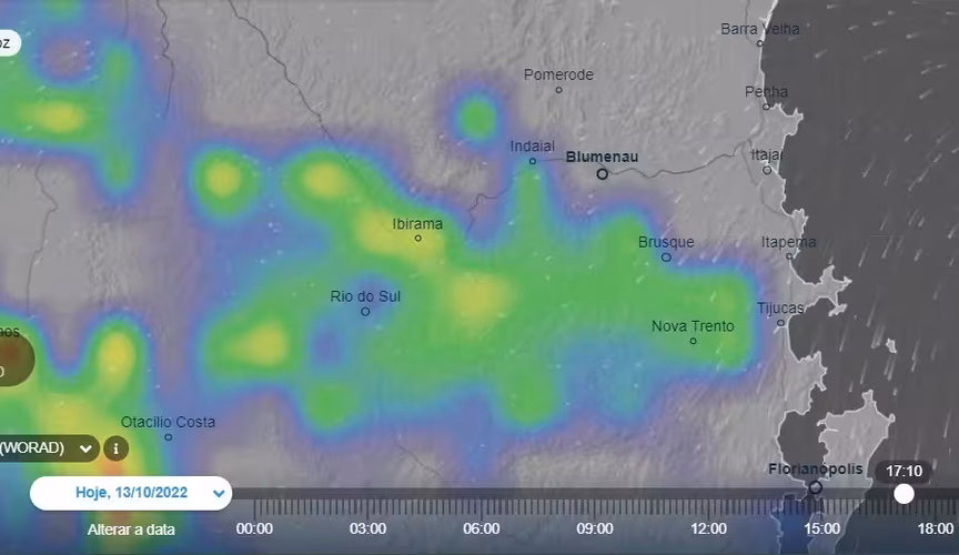 Abaixo separamos uma imagem de radar, com atualização das 17h10, mostrando chuva em parte do Vale do Itajaí nesse horário, ilustrada nas manchas coloridas da figura do mapa, sendo de fraca intensidade em verde e moderada nos pontos em amarelo.