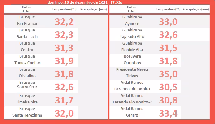 Confira também os picos máximos de temperaturas do dia registrados por todo o Vale do Itajaí-Mirim