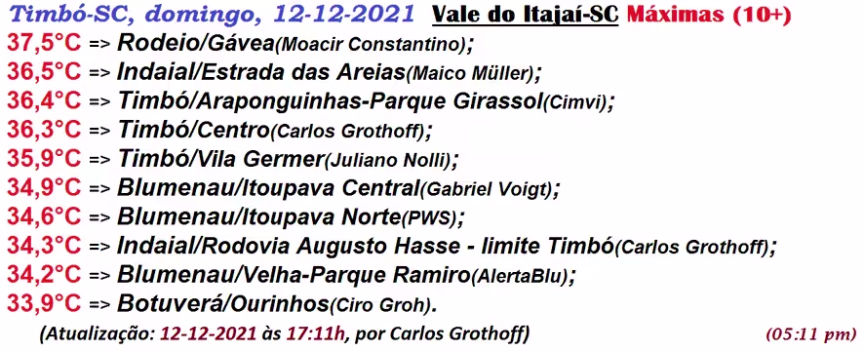 Na sequência desta edição, vamos continuar falando do calor, desta feita, só com os picos medidos no Vale do Itajaí-Mirim, que compreende a região de Brusque. Refresco somente para os moradores da Fazenda Rio Bonito, em Vidal Ramos:
