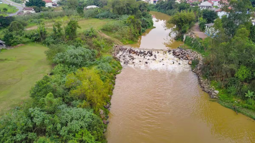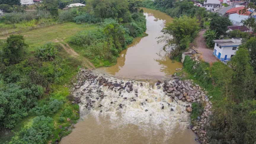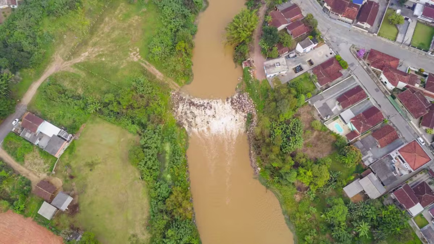 Nas fotos é possível notar a diferença no nível do rio Itajaí-Mirim se comparada com os meses anteriores, sob a ação da estiagem: