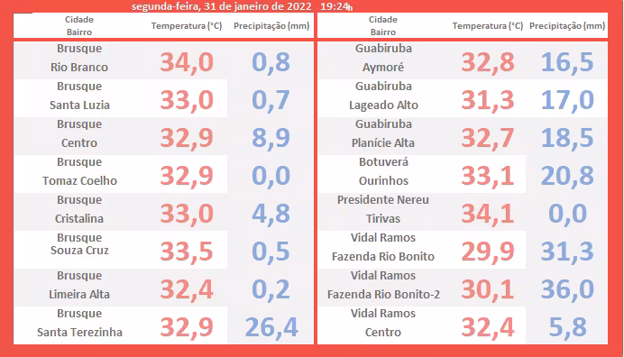 A tabela a seguir mostra os picos medidos não apenas no Vale do Itajaí-Mirim, mas em todo o Grande Vale do Itajaí. Pomerode, Timbó e Blumenau com 35ºC aferidos:
