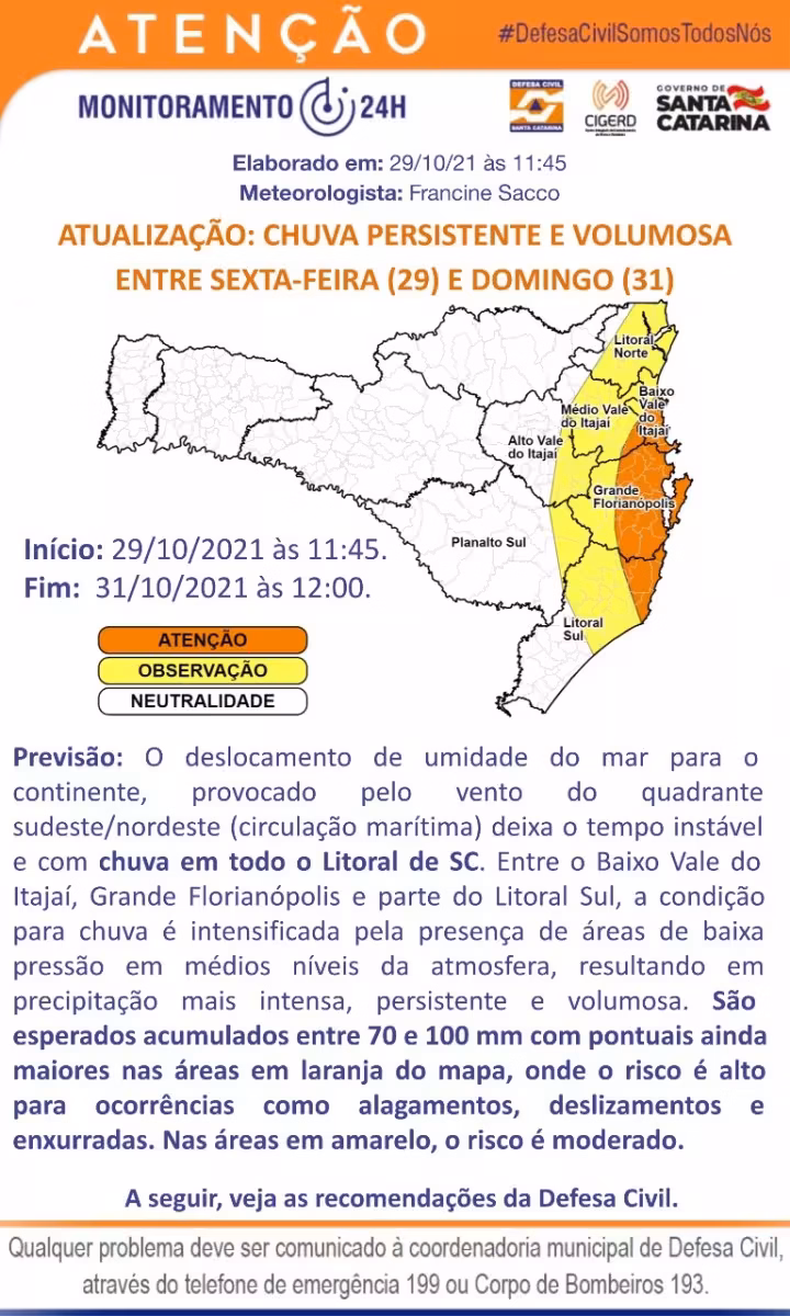Na tarde desta sexta-feira, 29, a Defesa Civil de Brusque informou que recebeu da Coordenadoria Estadual do órgão, aviso meteorológico de chuva persistente e volumosa na região até domingo, 31. São esperados acumulados entre 70 e 100 milímetros. Porém, p aviso prevê pontuais ainda maiores em determinadas regiões do estado, com alto risco para alagamentos, deslizamentos e enxurradas.