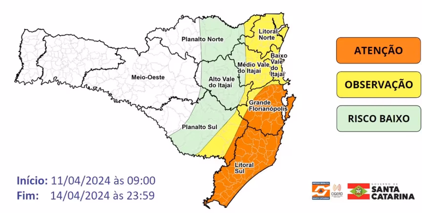 Nas áreas em laranja do mapa são esperados de 200 mm a 300 mm até o domingo, 14, com pontuais que podem superar os 350 mm, sendo a sexta-feira, 12, e o sábado, 13, os dias mais críticos, ou seja, os dias em que a chuva deve ser mais intensa e volumosa. Nessas áreas, Litoral Sul a Grande Florianópolis, o risco é alto a muito alto para ocorrências como alagamentos, deslizamentos, inundações e enxurradas.