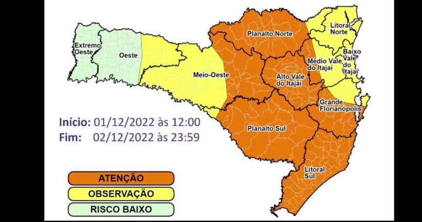 Regiões do Litoral Norte, Baixo Vale do Itajaí Médio Vale do Itajai, Grande Florianópolis e Parte do Meio-Oeste estão em observação. E a região do Oeste e Extremo-Oeste possuem um risco baixo para temporais.
