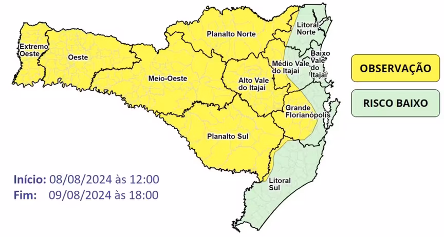 A Defesa Civil alerta a passagem de uma frente fria ao decorrer desta quinta-feira, 8, que favorece a ocorrência de pancadas de chuvas com raios e possíveis temporais isolados no Vale do Itajaí, incluindo o Planalto Norte, Litoral Norte e Norte do estado.