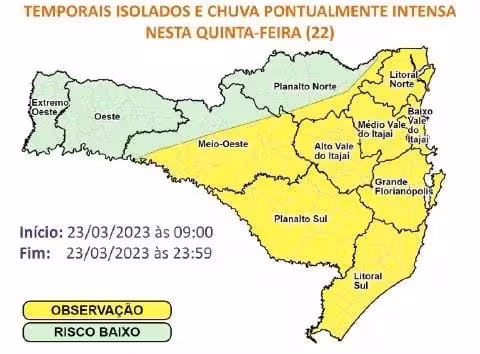 A Defesa Civil emitiu, na manhã desta quinta-feira, 23, um aviso meteorológico para possibilidade de temporais isolados e chuva pontualmente intensa nesta quinta para Brusque e todo o estado. A ocorrência se deve principalmente em virtude da instabilidade atmosférica.