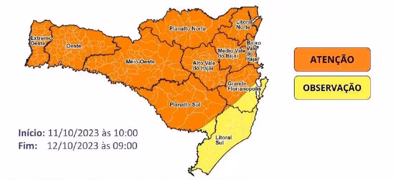 A Defesa Civil de Brusque emitiu um alerta para temporais e chuva intensa entre o fim da manhã desta quarta, 11, e a manhã da quinta-feira, 12.