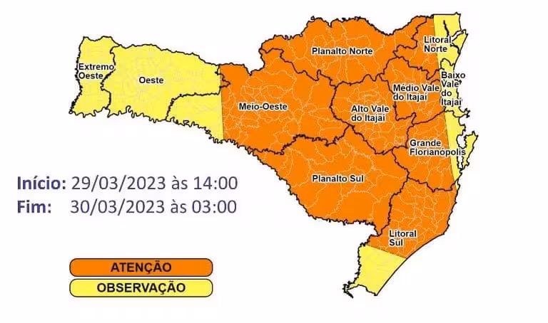 A Defesa Civil de Brusque está em estado de atenção para possibilidade de temporais entre a tarde desta quarta-feira, 29, e a madrugada de quinta-feira, 30, com chuva pontualmente intensa, raios, rajadas de vento e granizo.