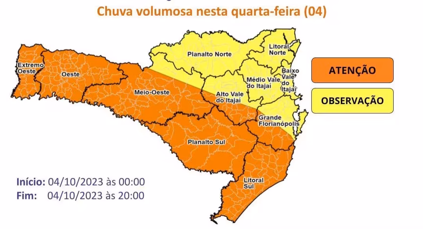 Segundo a Defesa Civil, esta condição ocorre devido a uma frente fria. Na quarta-feira, a previsão indica chuva volumosa em Santa Catarina, devido à intensidade e persistência deste sistema.