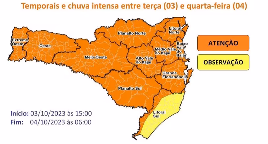Entre a tarde desta terça-feira, 3, e madrugada de quarta, 4, devem ocorrer temporais em todo o estado, acompanhados de rajadas de vento e chuvas intensas. Em Brusque o risco é alto para ocorrências como destelhamentos, queda de árvores, danos à rede elétrica, e alagamentos.