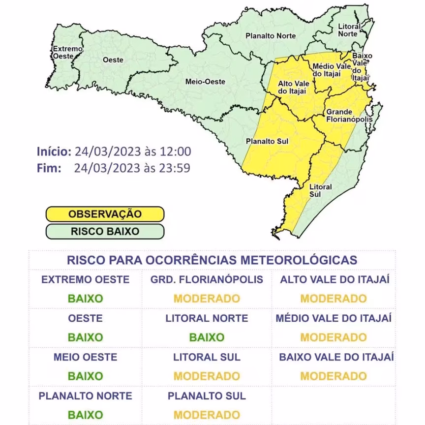 O risco é moderado para ocorrências associadas aos temporais e a chuva intensa, como alagamentos e enxurradas.