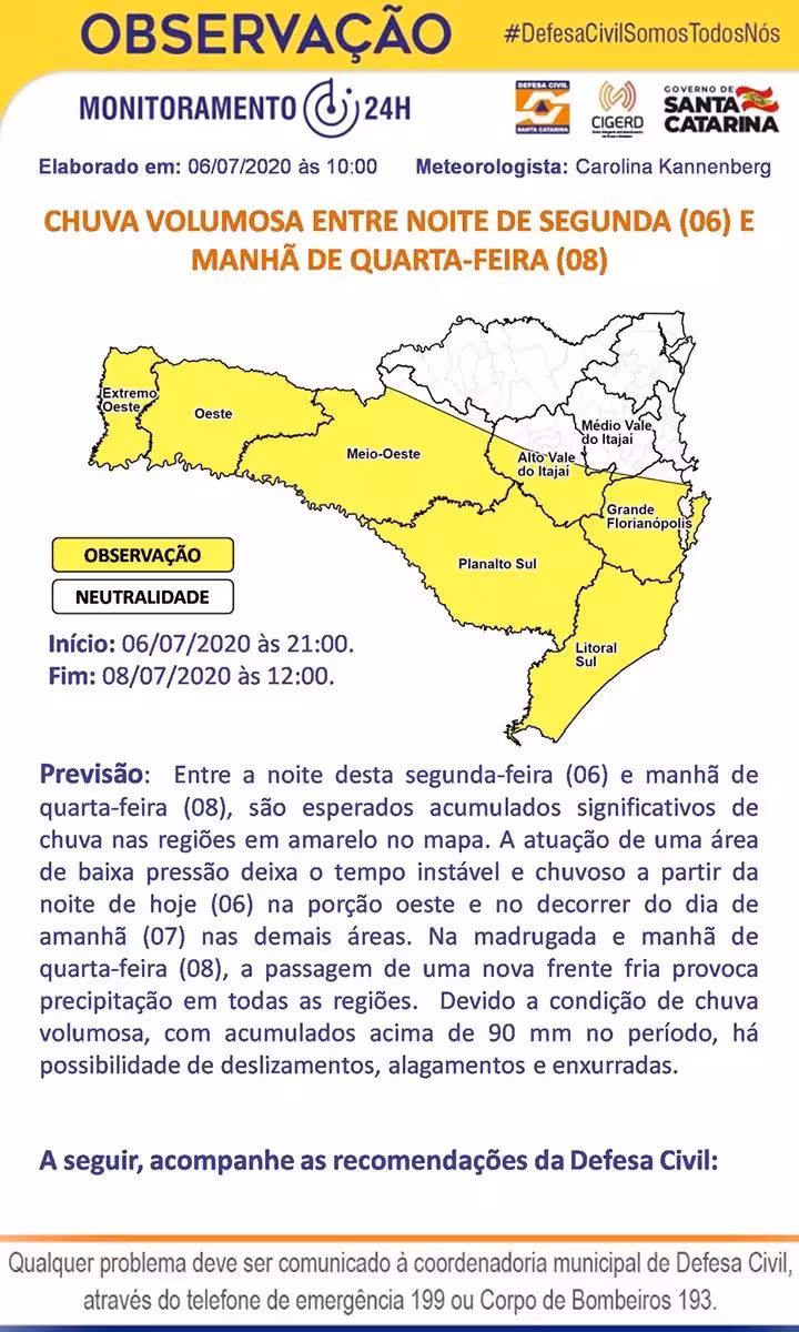 A Coordenadoria de Proteção e Defesa Civil de Brusque divulga aviso meteorológico emitido pela Defesa Civil Estadual nesta segunda-feira, 6, com a previsão de chuvas, frio e ventos fortes durante toda a semana.