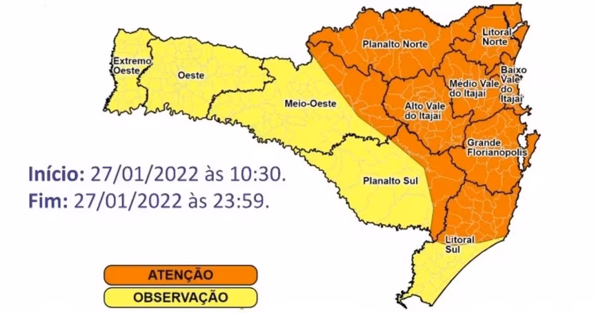 Segundo o órgão, a mudança no clima deve iniciar ainda pela manhã nas áreas de divisa com o Rio Grande do Sul e se espalha pelo território catarinense ao longo do dia. A região do Vale do Itajaí está inclusa na área de atenção.