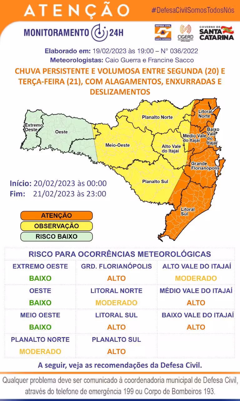 No próprio alerta, a Defesa Civil aponta que em qualquer ocorrência os moradores podem acionar o órgão de cada cidade pelo telefone 199 ou até o Corpo de Bombeiros Militar, pelo 193.