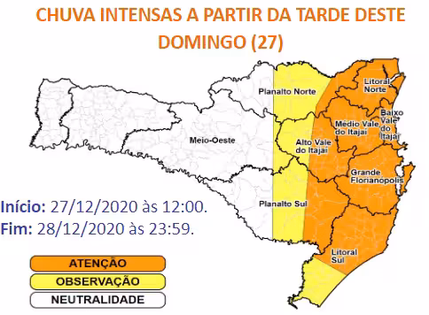 Além da região do Vale do Itajaí, o órgão também alerta as regiões da Grande Florianópolis, Litoral Sul, Litoral Norte, Baixo Vale do Itajaí, além de parte do Alto Vale do Itajaí, Planalto Sul e Planalto Norte.