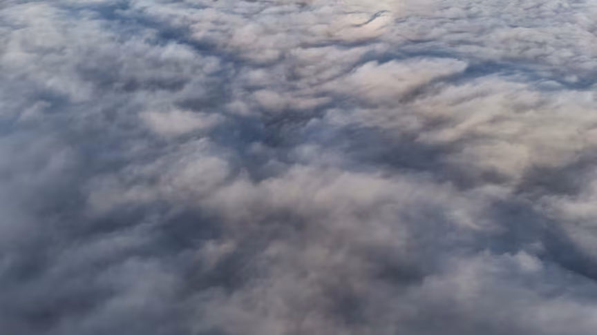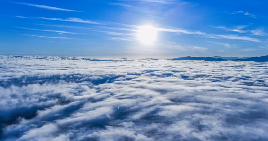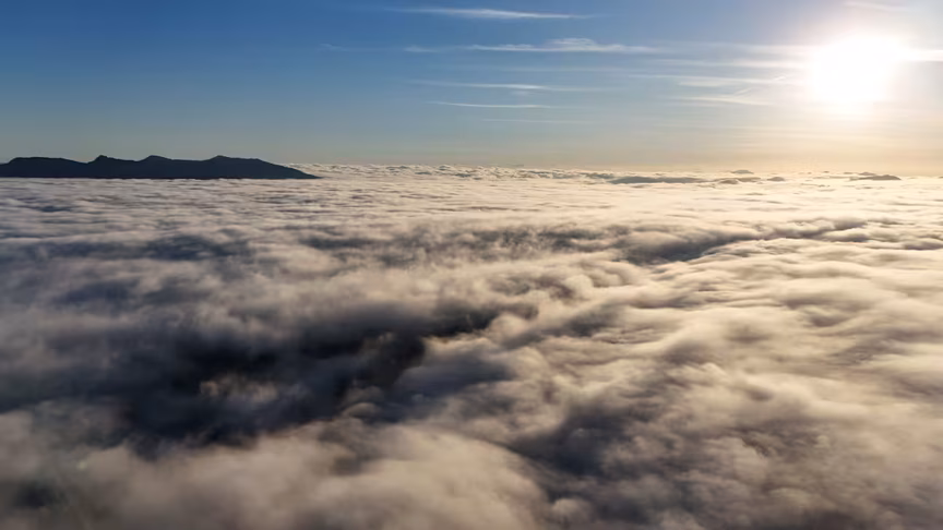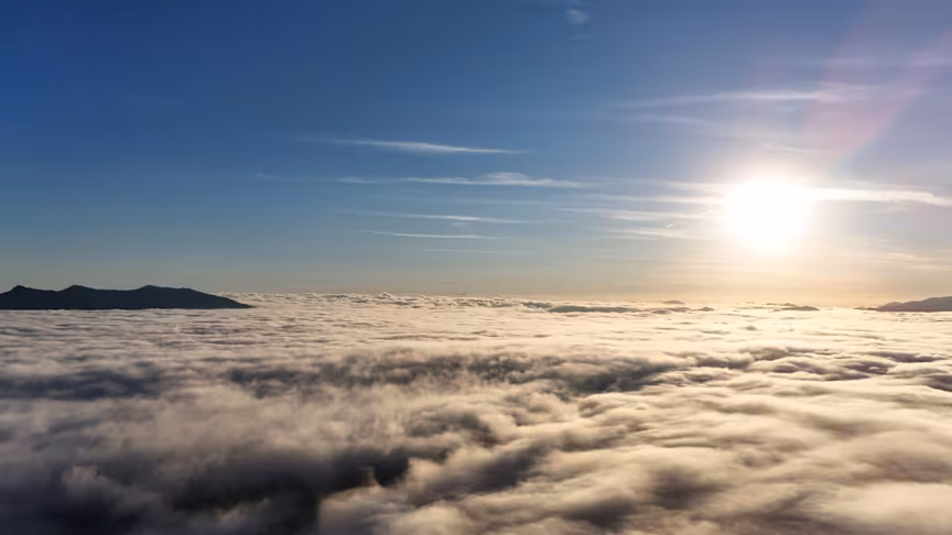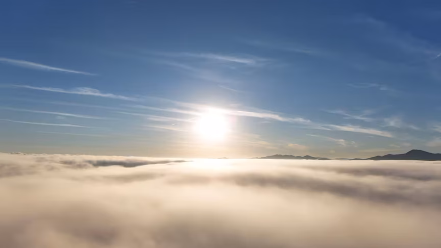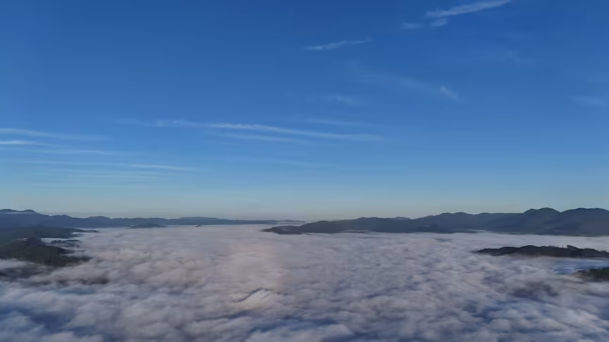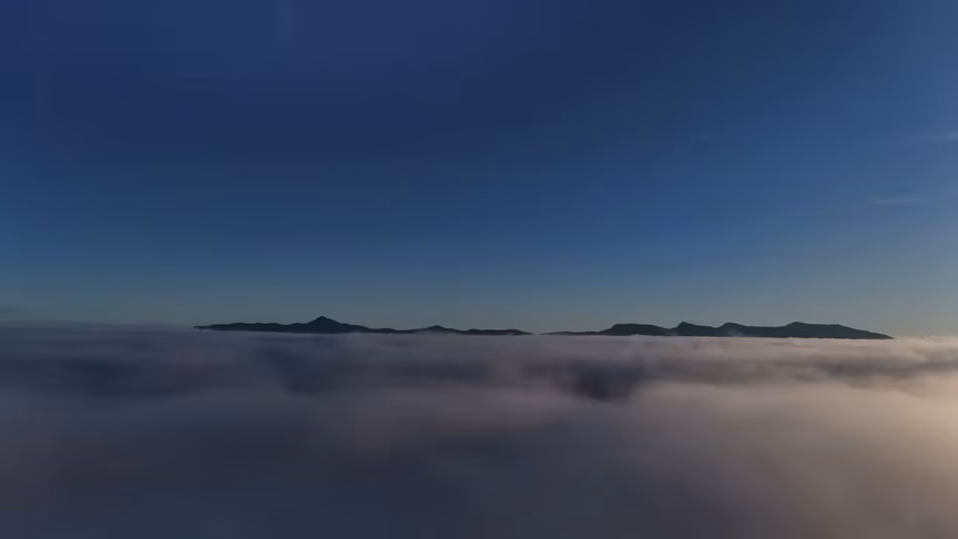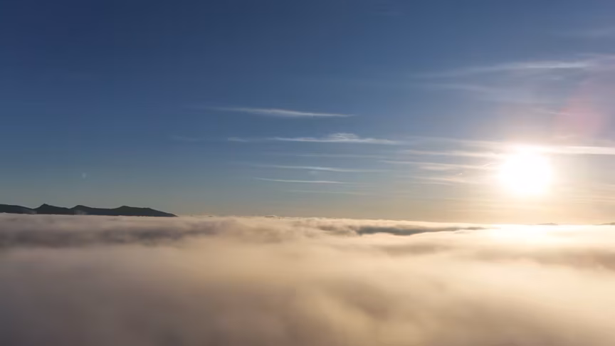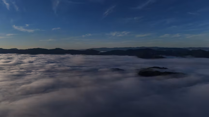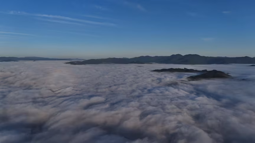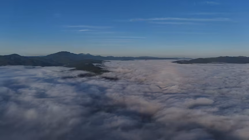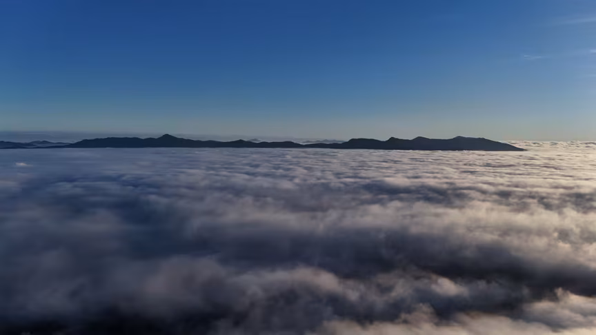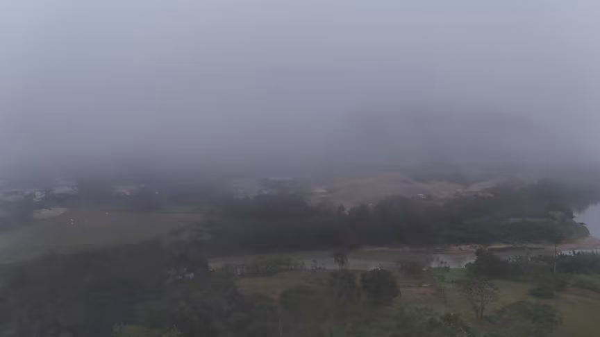 Enquanto a paisagem permanecia encoberta ao nível do solo, imagens captadas por drone revelaram uma perspectiva oposta.