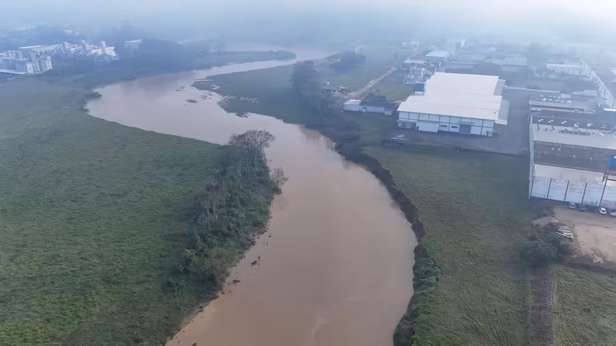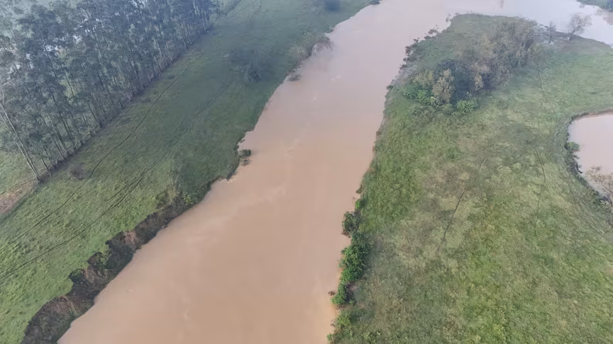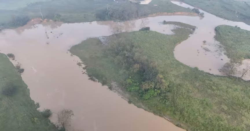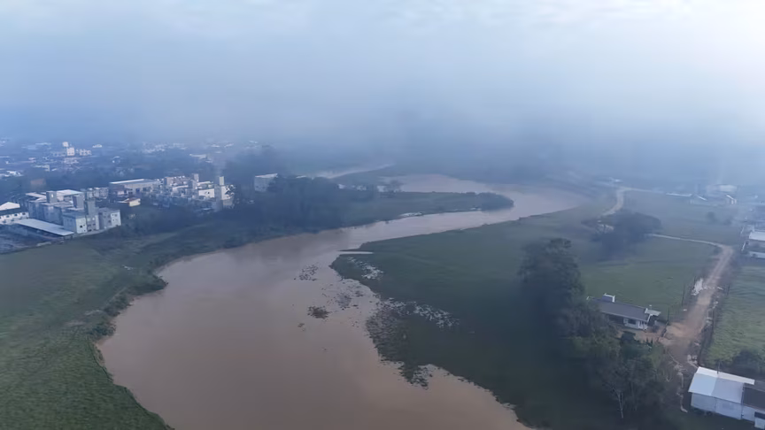 As imagens aéreas capturadas revelam que, apesar do nível elevado, o curso d'água permanece dentro de sua calha, afastando o risco imediato de transbordamento.