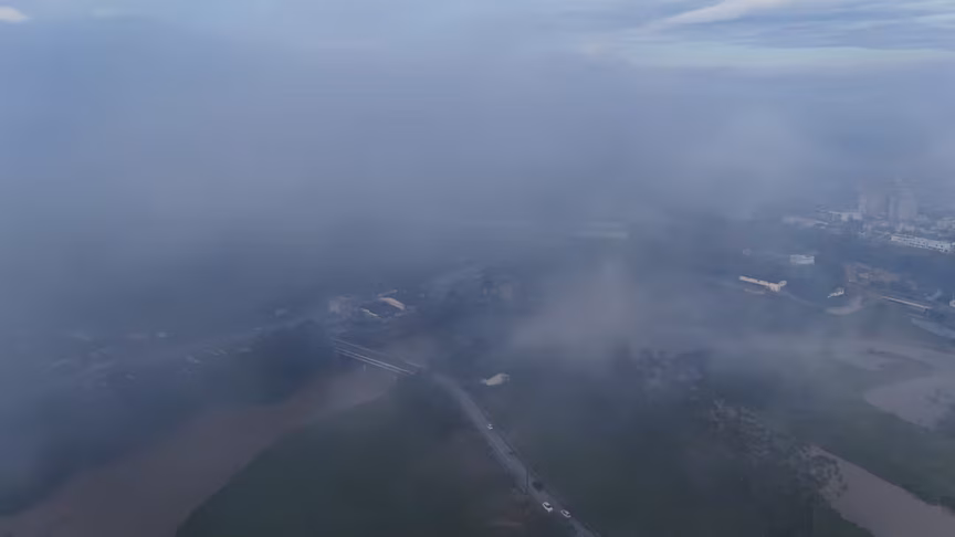 As imagens capturadas, pois, exibem uma Brusque envolta em neblina, com pontuais aberturas de sol.
