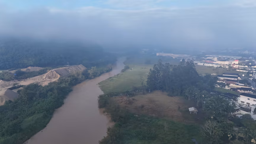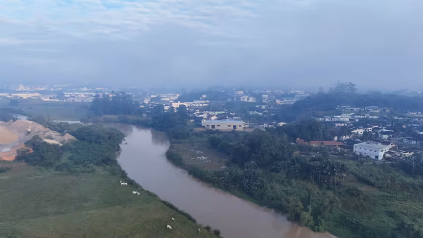 Para monitorar a evolução da situação e avaliar o comportamento do rio Itajaí-Mirim após as precipitações, um drone realizou um sobrevoo detalhado sobre áreas que abrangem os bairros Dom Joaquim e Rio Branco.