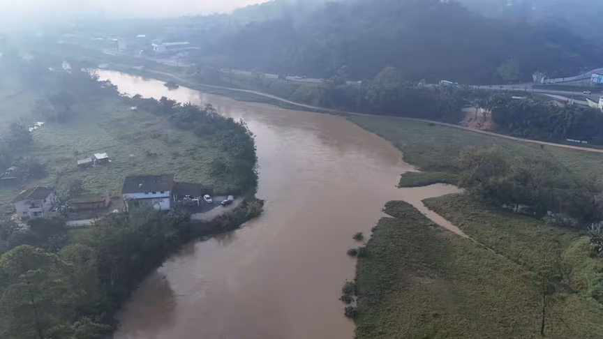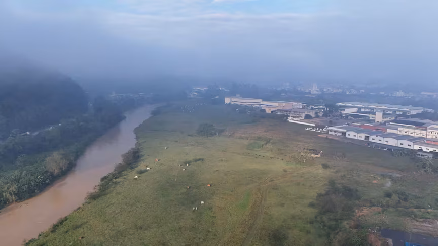 Os registros revelam diferentes cenários de Brusque após as chuvas, destacando tanto a situação do rio Itajaí-Mirim — que, embora apresente nível elevado, permanece dentro da calha — quanto as paisagens deslumbrantes vistas do alto.