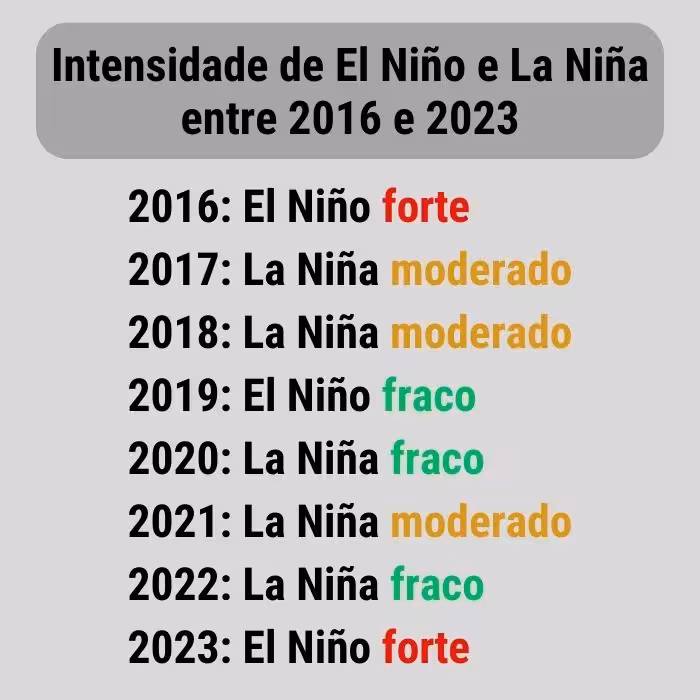 Dados da Defesa Civil e da Epagri-Ciram mostram a intensidade do El Niño e do La Niña ao longo dos anos, desde a última intensidade forte até então. Desde 2016, foram três anos de efeitos do El Niño e cinco de efeitos do La Niña. O ano atual marca o retorno da atuação do El Niño após três anos.