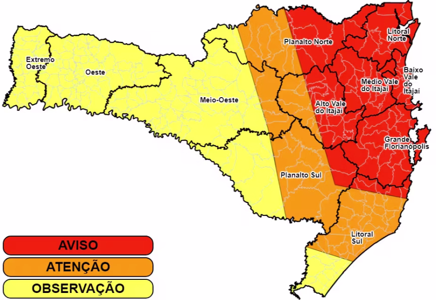 A previsão para esta semana também atinge as regiões da Grande Florianópolis, Vale do Itajaí e Litoral Norte, locais já bastante prejudicados com as enxurradas dos últimos dias.