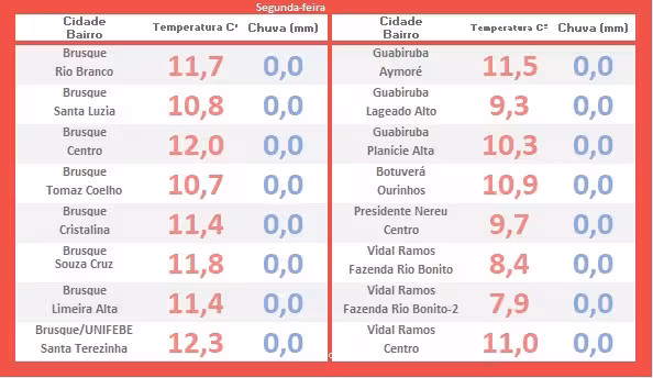 Na tabela subsequente, você terá acesso às temperaturas mínimas que foram registradas imediatamente após o amanhecer, apresentadas de forma destacada em tons de vermelho, para cada localidade mencionada.