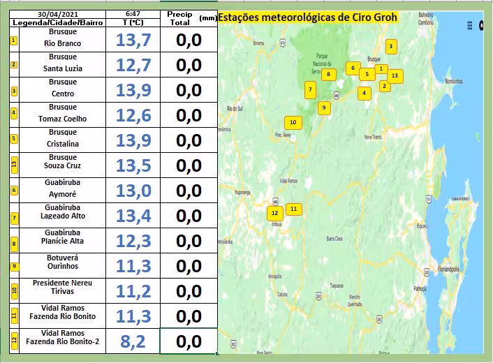 Abaixo estão os índices mínimos conferidos no amanhecer desta sexta-feira, 30, correspondentes a cada lugar descrito em anexo na tabela: