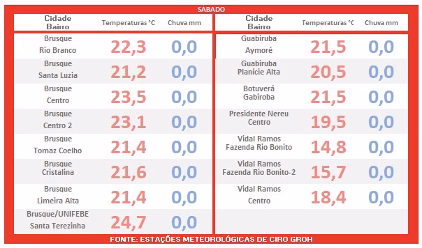 Com efeito, a partir da tarde, o avanço de uma frente fria sobre o Vale do Itajaí-Mirim sinaliza risco de chuva em forma de pancadas, possivelmente acompanhadas por trovoadas.