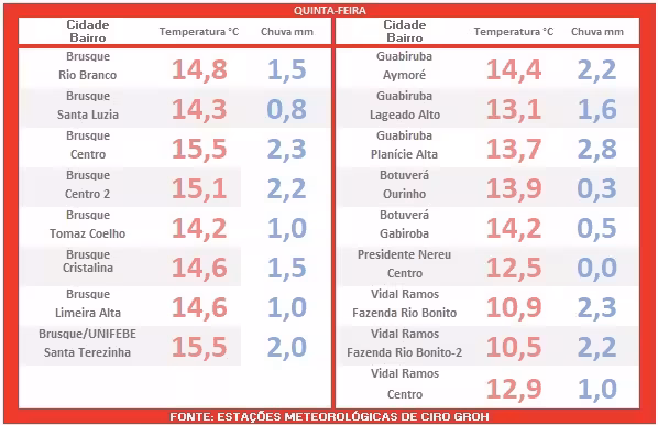 Antes disso, a tabela a seguir apresenta as temperaturas máximas registradas por volta das 13h em diferentes áreas do Vale do Itajaí-Mirim, destacadas em vermelho.