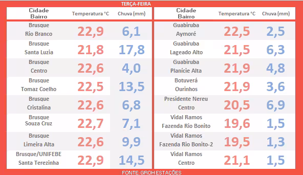 Já as tardes não terão uma queda muito acentuada por parte dos termômetros, que devem seguir dentro de um padrão outonal, diante de máximas oscilando entre 24°C a 26°C em Brusque e toda a região.