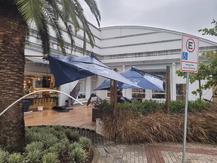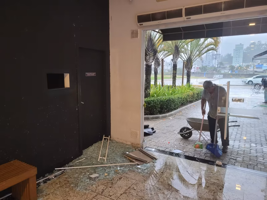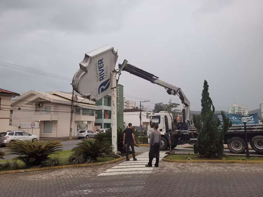 A placa do River Mall, de frente para a avenida Otto Renaux, caiu e foi retirada. Cadeiras com guarda-sóis foram derrubados. Nos fundos do River Mall, houve destelhamento. Parte de uma porta de vidro quebrou.