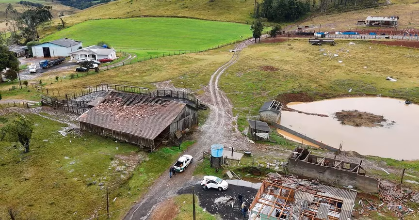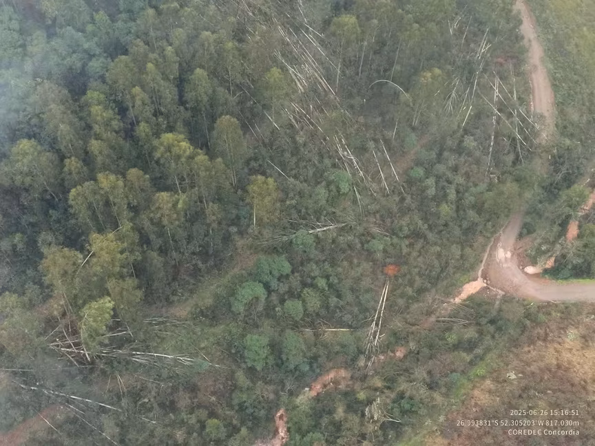 Em nota, a Defesa Civil já havia confirmado um tornado em Passos Maia. Um sobrevoo com drone realizado pela Coordenadoria Regional de Proteção e Defesa Civil (Coredec) constatou danos severos na vegetação, com árvores de grande porte tombadas, além da destruição de galpões e residências.