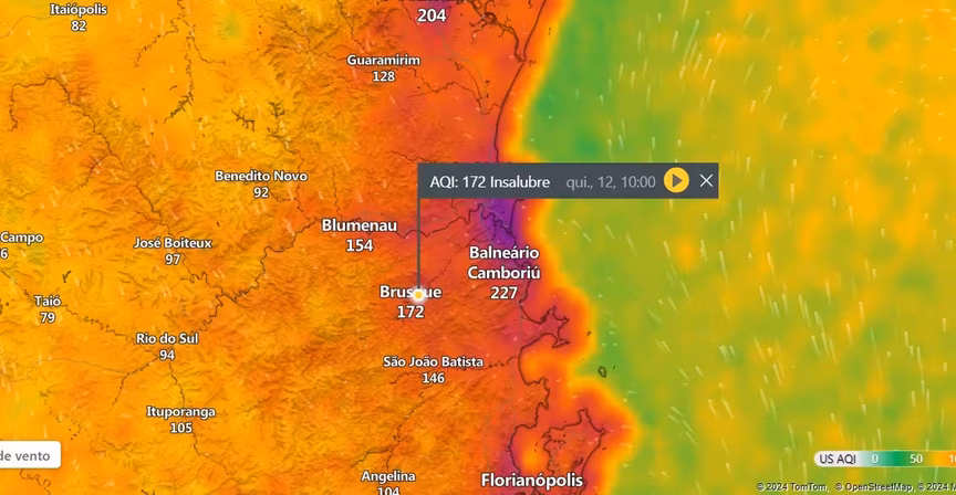 A qualidade do ar em Brusque piorou em menos de 24 horas. Às 12h da quarta-feira, 11, o Índice de Qualidade do Ar (IQA) marcava 168, que já é considerado insalubre. Já às 10h desta quinta-feira, 12, o índice era de 172. Os dados são da plataforma de clima do MSN.