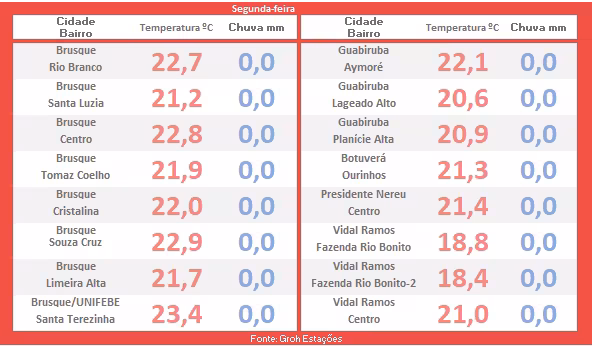 Vale destacar que, ainda na terça-feira, está prevista a chegada de um ar mais seco e ameno para Brusque e região, proporcionando um alívio ao calor intenso.