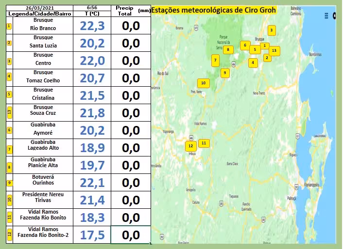 As temperaturas mínimas da madrugada desta sexta-feira por todo o Vale do Itajaí-Mirim você confere na tabela exposta a seguir. Não houve registro de chuva no período.