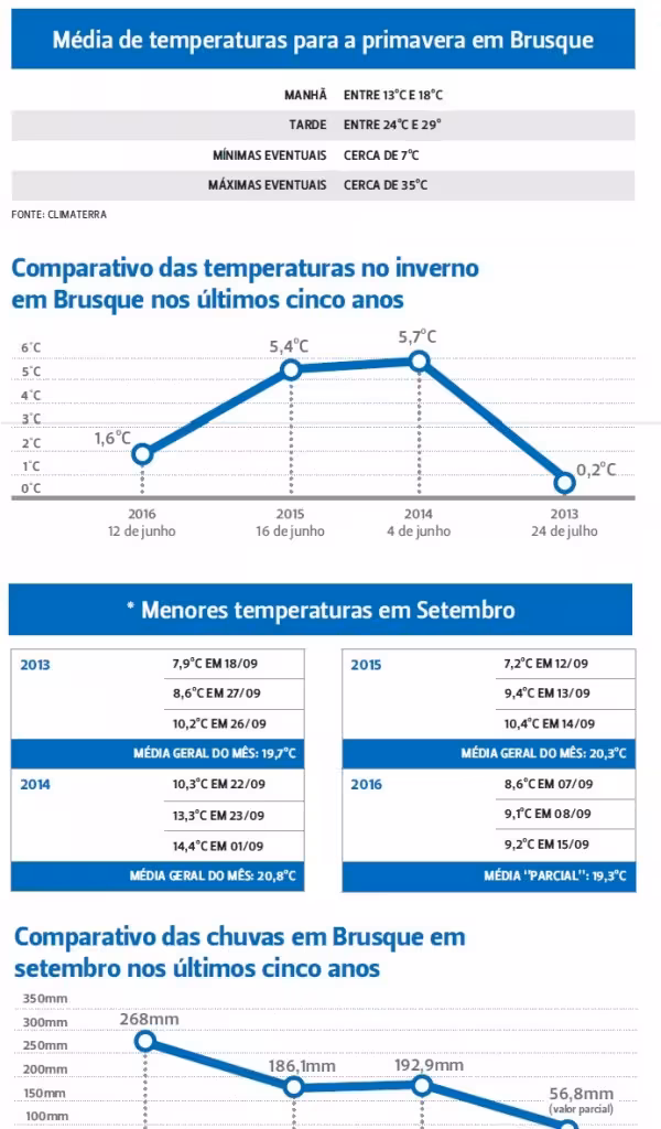 Neste ano o inverno em Brusque foi o mais frio dos últimos três anos. Em 12 de junho foi registrado 1,6ºC na estação do bairro Rio Branco do observador do tempo Ciro Groh, blogueiro no Município Dia a Dia – essa foi a menor temperatura do ano. Somente em 2013 o inverno havia sido mais rigoroso, quando em 24 de julho marcou-se 0,2ºC. Além do frio mais ameno, as chuvas em setembro também ficaram abaixo da média histórica. Em 2013, por exemplo, foi registrado 268mm e em 2016, 56,8mm (ver no detalhe todos os números).