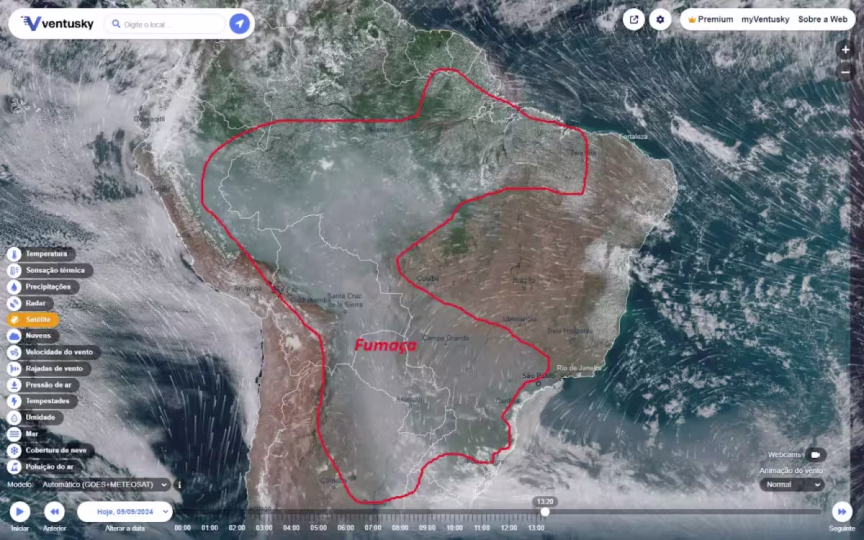 Além do vento, a presença de uma massa de ar quente e seco em grande parte do Brasil, favorecendo as altas temperaturas e a umidade do ar muito baixa, torna-se mais um agravante para a maior concentração desta fumaça na atmosfera.