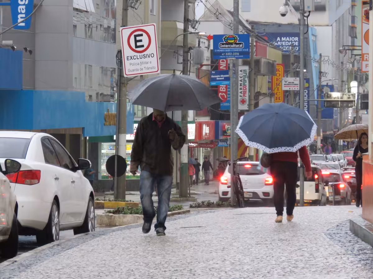 Aviso meteorológico emitido pela Defesa Civil estadual às 16h45 prevê pancadas de chuva moderadas a fortes para a região do Vale do Itajaí nas próximas duas horas.